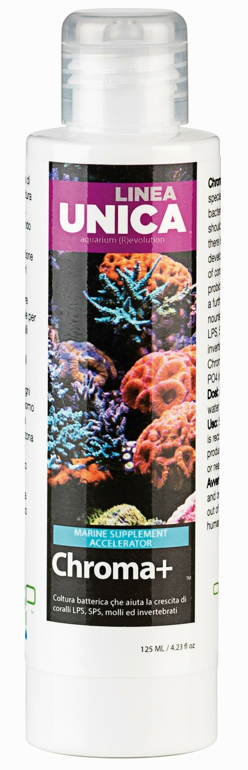 Chroma+ una miscela di batteri probiotici da coltura altamente specializzata. Chroma+ va usato quando si ha una carenza nello sviluppo o nella colorazione dei coralli. Questi batteri probiotici specializzati costituiscono un ulteriore nutrimento fondamentale per i coralli, LPS, SPS, coralli molli ed invertebrati.
