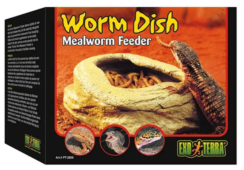 Il Worm Dish di Exo Terra consente ai rettili di vedere il loro cibo (vermi della farina), ma l'anello di bordo appositamente progettato impedisce ai vermi della farina di scappare